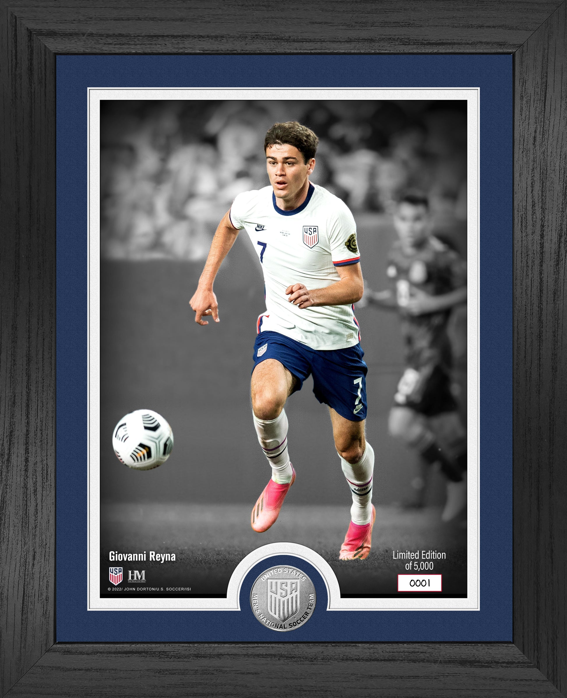 This limited edition 13” x 16” wood frame with double matting under glass features, an exclusive hand numbered Giovanni Reyna 8"x10" photo combined with a US Men's Soccer Team 39mm minted silver plated coin. As a limited edition of only 5000 and officially licensed by the USA Soccer. Each photo mint is accompanied by a certificate of authenticity. Proudly made in the USA.