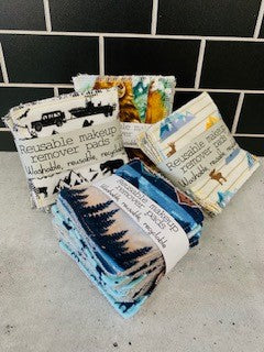 10 washable, reusable, recyclable makeup remover pads made in Alaska. Flannel front, terry cloth back. Wash in cold water and air dry. Measures 3.25" square. Patterns vary.